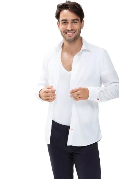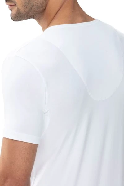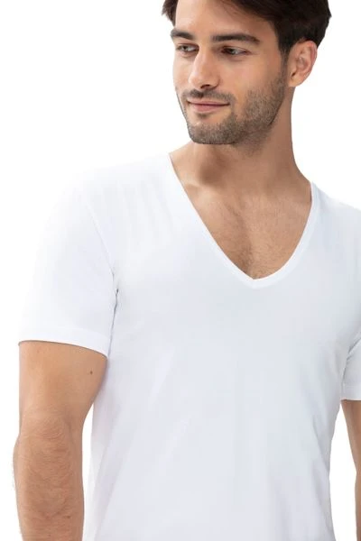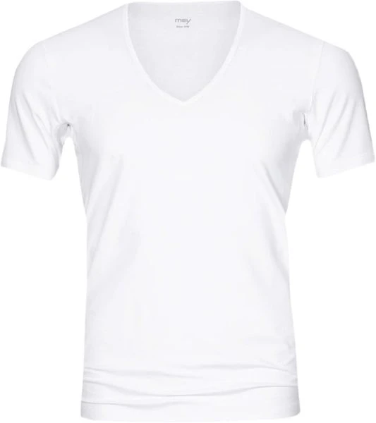 Met dit witte Mey T-shirt uit de ‘Dry Cotton Functional’ collectie haal je een fijne basic in huis. Het shirt heeft een diepe V-hals waardoor deze niet te zien is bijvoorbeeld tijdens het dragen van een overhemd. Door de langere achterkant schuift het shirt niet uit de broek.