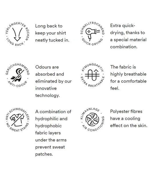 Het herenshirt heeft een getailleerde Slim-Fit pasvorm waardoor deze slank langs het lichaam valt en je zo voorziet van een aangenaam draagcomfort. Daarnaast is het T-shirt gemaakt van 57% katoen, 38% polyester en 5% elastaan (stretch). Dankzij deze materiaalcombinatie is de stof enorm sneldrogend en door de innovatieve techniek worden geuren opgenomen en gebonden. Door hydrofiele en hydrofobe stoflagen onder de oksels worden zweetvlekken voorkomen.