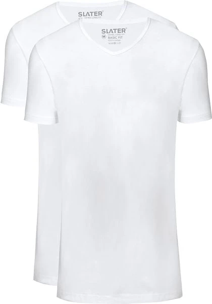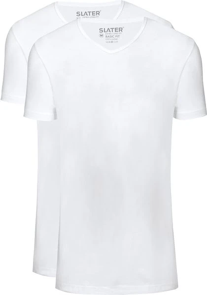 Met dit T-shirt van Slater haal je een goede basis van je outfit in huis. Het shirt heeft een heldere witte kleur en is voorzien van een v-hals. Ideaal om te gebruiken als ondershirt in combinatie met een overhemd, pullover, cardigan of blazer.Â
