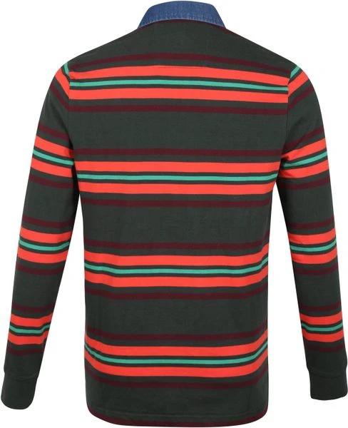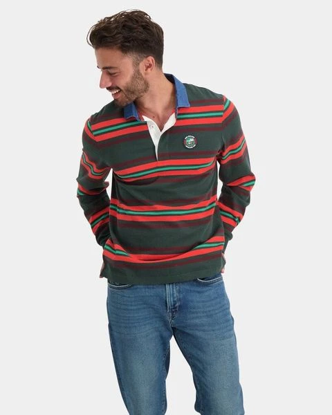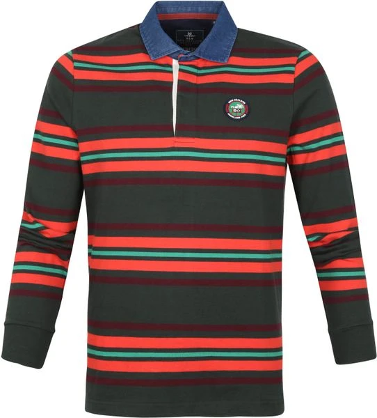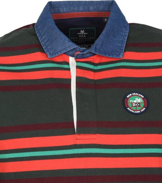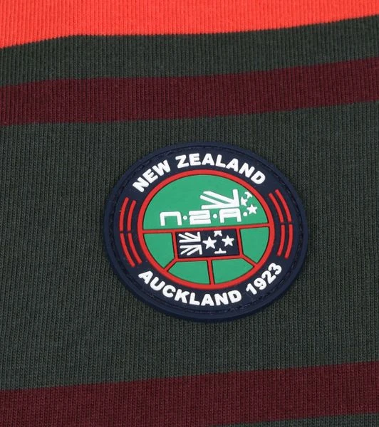 Een avontuurlijk karakter in een casual stijl: daar staat de kleding van New Zealand Auckland om bekend. Dit longsleeve (LS) Tinline poloshirt heeft een donkergroene ‘Bay Leaf’ kleur met rode en groene strepen en is voorzien een merklogo op de borst. Daarnaast is de polo afgewerkt met een drieknoopssluiting, waarvan 2 met een blinde sluiting, lange mouwen en een blauwe jeans kleur boord.
